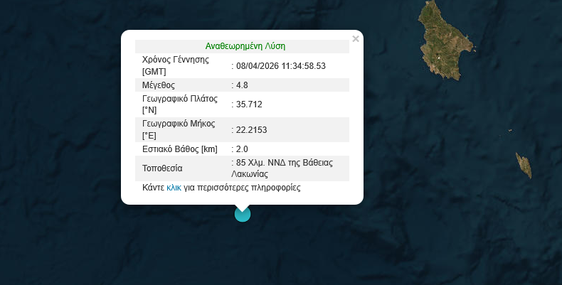 Σεισμός 4,8 Ρίχτερ νότια – νοτιοδυτικά της Λακωνίας σημειώθηκε το μεσημέρι της Μεγάλης Τετάρτης, 8 Απριλίου.