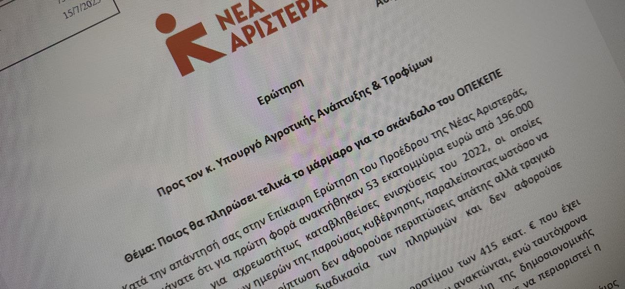 Στις 2 Δεκεμβρίου, η Νέα Αριστερά καταθέτει ερώτηση με θέμα «Καταρρέει ο ΟΠΕΚΕΠΕ: Η κυβερνητική αδράνεια και τα πολλαπλά σκάνδαλα στον αγροτικό τομέα», όπου πραγματοποιεί μια επισκόπηση όσων έχουν γίνει μέχρι εκείνη τη στιγμή και με 14 ερωτήματα προς το ΥΠΑΑΤ ζητάει εξηγήσεις για όλα τα ύποπτα φαινόμενα που έχουν σημειωθεί μέχρι εκείνη τη στιγμή.