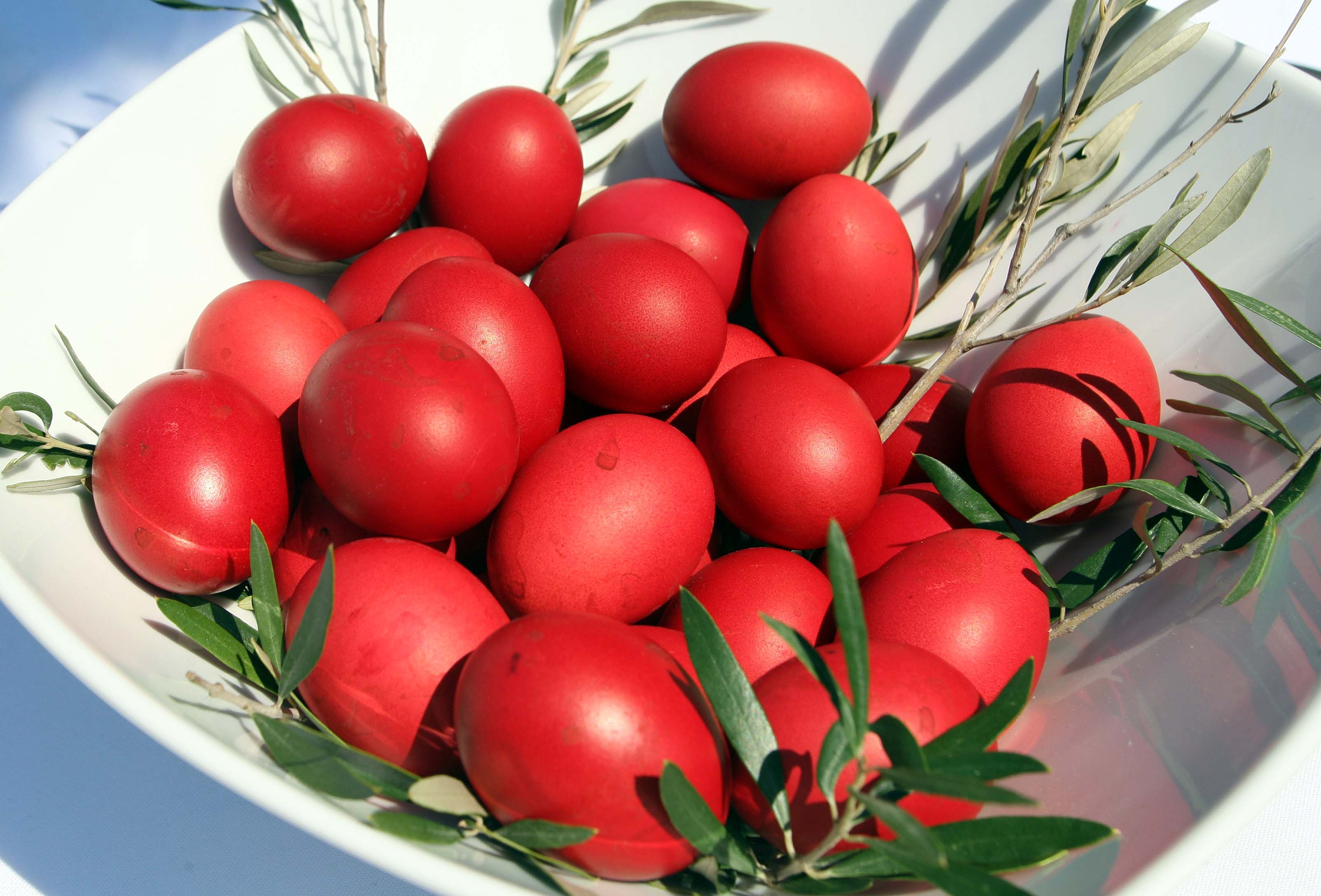 Τα κεντούσαν ή τα ζωγράφιζαν με φύλλα, κρεμμυδόφυλλα, ζυμάρι, λειωμένο κερί κλπ. Σύμφωνα με μια παράδοση «όταν αναστήθηκεν ο Χριστός, τό ’παν σε μιά χωρική κι αυτή δεν πίστεψε και είπεν: Όταν τ’ αυγά γίνουν κόκκινα, τότε θ’ αναστηθή και ο Χριστός. Και αυτά κοκκίνησαν. Και από τότε τα βάφουν κόκκινα». Άλλη παράδοση αναφέρει ότι βάφονται κόκκινα για το αίμα του Χριστού ή για τη χαρά της Αναστάσεως και την αποτροπή του κακού. Για τον ίδιο λόγο, αναρτούν στα παράθυρα και τα μπαλκόνια κόκκινα υφάσματα.