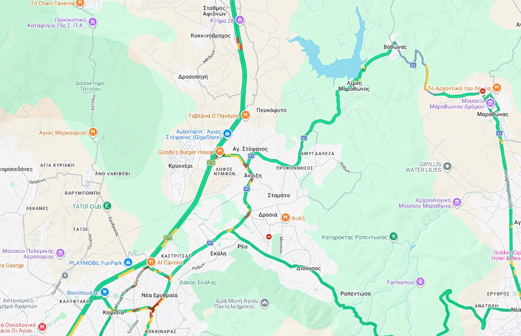 Επίσης αρκετή κίνηση υπάρχει και στην Αττική Oδό, όπου οι καθυστερήσεις, στο ρεύμα προς Ελευσίνα, από κόμβο Μαραθώνος έως κόμβο Μεταμόρφωσης, φτάνουν τα 30 λεπτά.