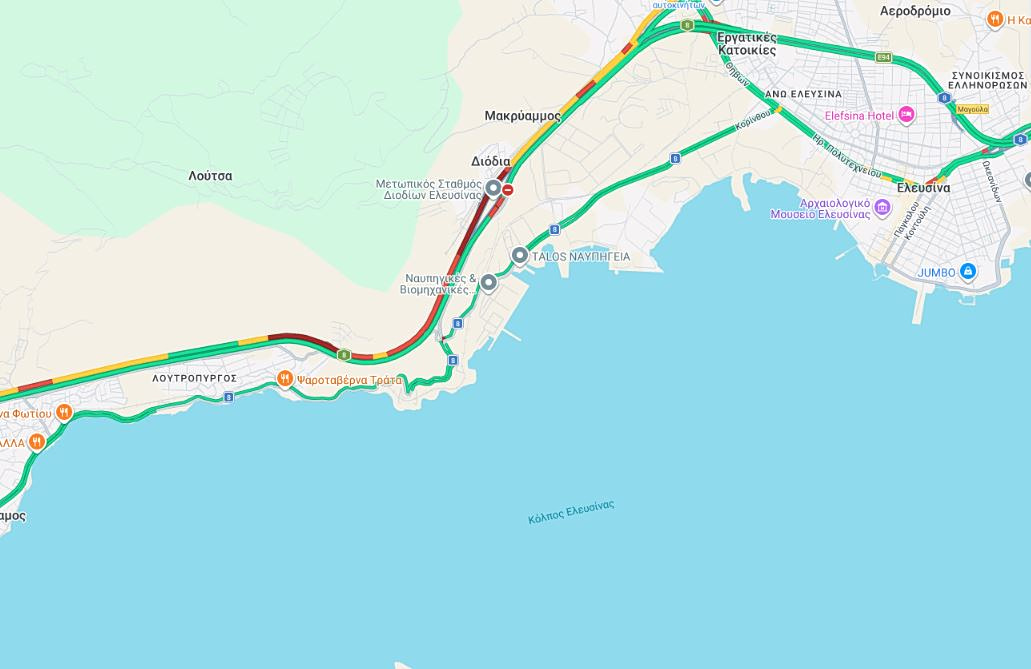 Τα οχήματα κινούνται με πολύ χαμηλές ταχύτητες στη λεωφόρο Αθηνών από το Παλατάκι μέχρι τα διυλιστήρια Ασπροπύργου, καθώς και στη λεωφόρο Σχιστού προς Σκαραμαγκά
