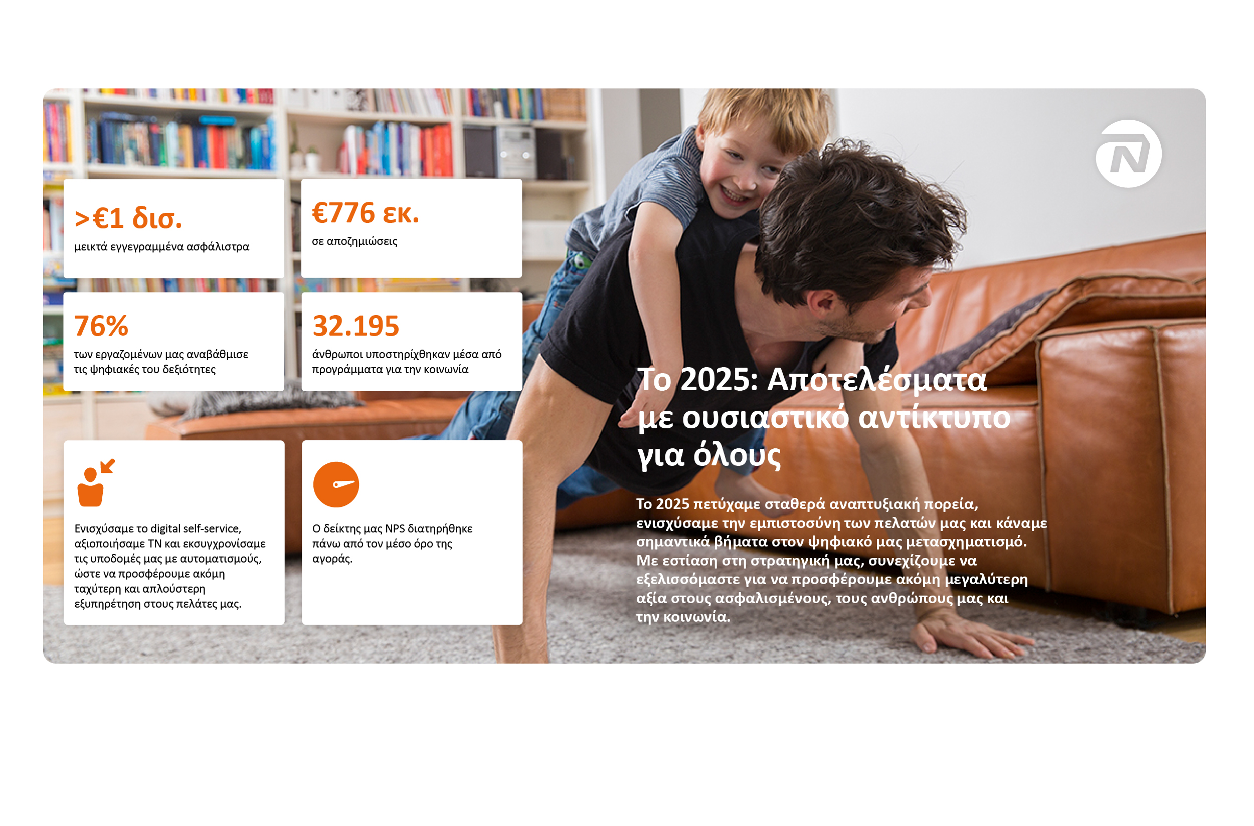 Το 2025 ολοκληρώθηκε για την NN Hellas επιβεβαιώνοντας τη σταθερά αναπτυξιακή της πορεία και την προσήλωσή της στη δημιουργία μακροπρόθεσμης αξίας για πελάτες, εργαζομένους, συνεργάτες και κοινωνία. Με επίκεντρο την εμπειρία του πελάτη μέσα από σταθερές επενδύσεις στον ψηφιακό της μετασχηματισμό και την ανάπτυξη των ανθρώπων της, η εταιρία συνεχίζει να ενισχύει τη θέση της στην ελληνική αγορά ιδιωτικής ασφάλισης.