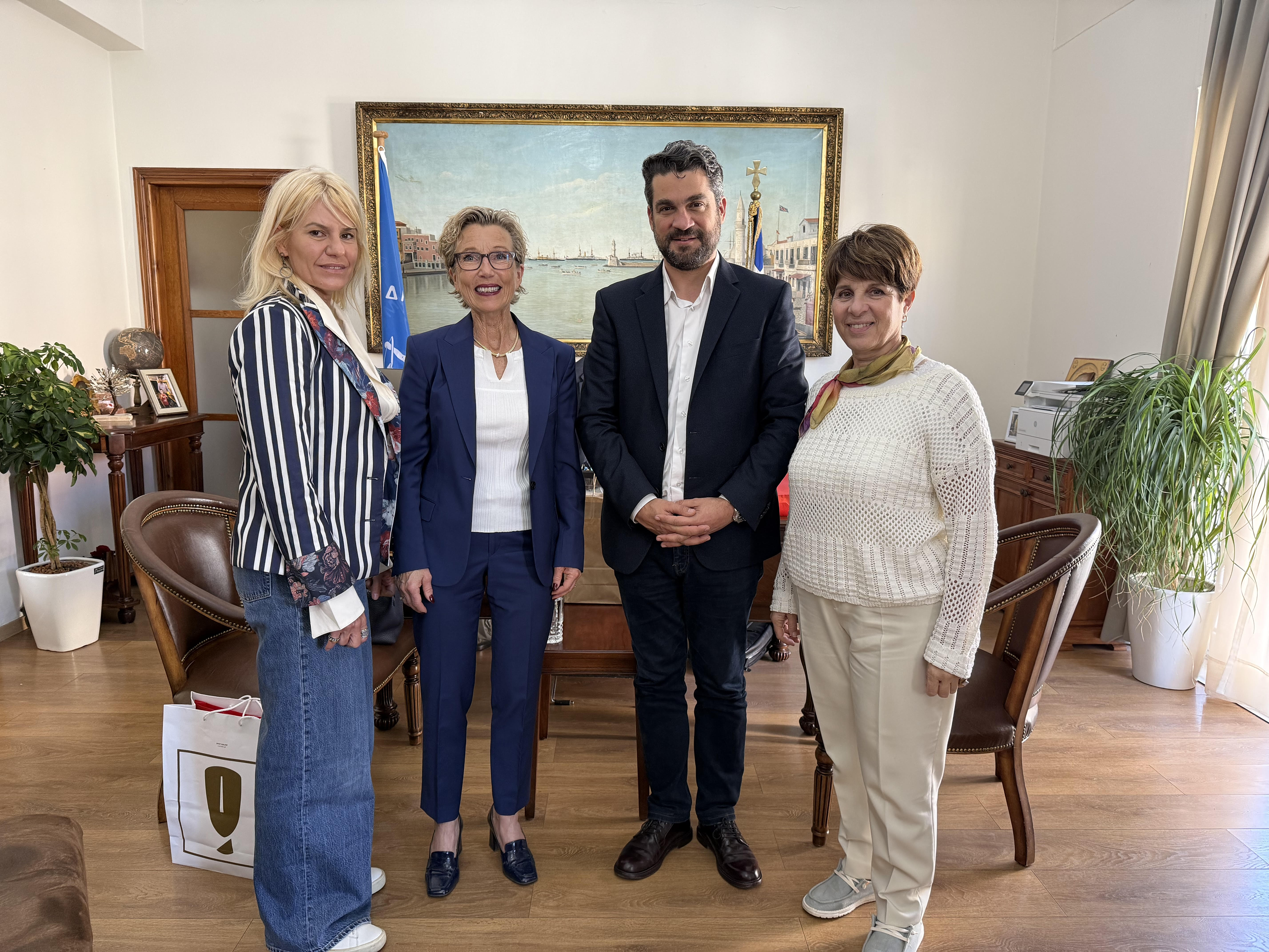 Κατά τη διάρκεια της συνάντησης, ο κ. Σημανδηράκης και η κα. Berg είχαν την ευκαιρία να ανταλλάξουν απόψεις για μια σειρά ζητημάτων κοινού ενδιαφέροντος, με έμφαση στο μεταναστευτικό, καθώς και στην κρίση κατοικίας που παρατηρείται στα Χανιά και επηρεάζει την καθημερινότητα των κατοίκων.