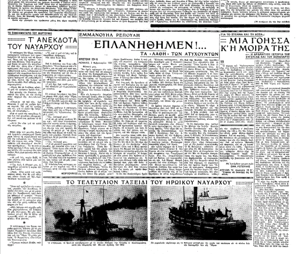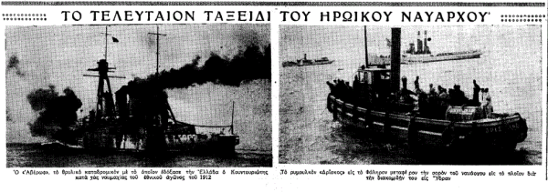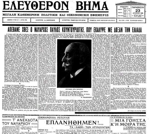 Στο φύλλο του «Ελευθέρου Βήματος» που είχε κυκλοφορήσει την επομένη του θανάτου του ναυάρχου, την Παρασκευή 23 Αυγούστου 1935, ο Σπύρος Μελάς είχε σπεύσει να τιμήσει τη μνήμη του, μέσω της στήλης που διατηρούσε στην εφημερίδα.