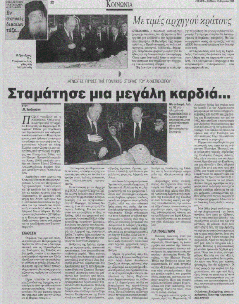 Το πορτρέτο αυτό το γράφω τις πρωινές ώρες της Παρασκευής 10 Απριλίου (σ.σ. του έτους 1998). Μόλις έχω γυρίσει από το Λαϊκό. Για τον Αρχιεπίσκοπο Σεραφείμ, με τον οποίο υπήρξα συνεργάτης από το 1977 και Σύμβουλος και Εκπρόσωπός του από το 1982, που απεβίωσε ο προκάτοχός μου Χρήστος Θεοδωρόπουλος (με δική του επιλογή), θα γράψω εκτενέστερα. Του οφείλω ένα βιβλίο, το οφείλω και στην Εκκλησία και στον τόπο μας. Τώρα θέλω να κλείσω με τούτη τη μαρτυρία.