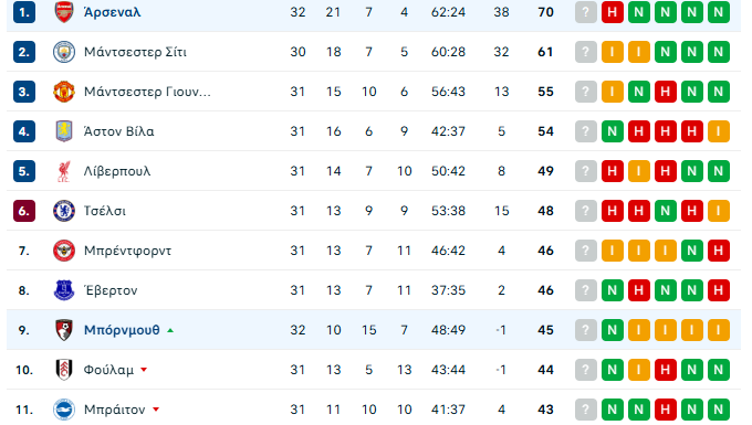 Η Άρσεναλ έχασε με 2-1 εντός έδρας απέναντι στην Μπόρνμουθ για την 32η αγωνιστική της Premier League και παρέμεινε στους 70 βαθμούς με τη Σίτι να έχει δύο ματς λιγότερα και να βρίσκεται στους 61.