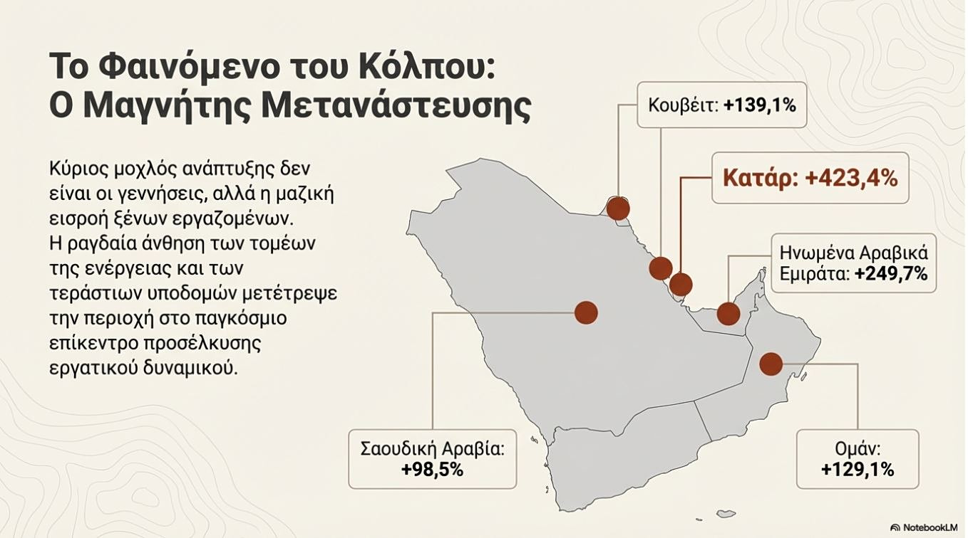 Το Κατάρ ξεπερνά κατά πολύ κάθε άλλη χώρα, με τον πληθυσμό του να έχει αυξηθεί περισσότερο από πέντε φορές (+423,4%) από το 2000. Αυτή η ραγδαία αύξηση οφείλεται σε μεγάλο βαθμό στην εισροή ξένων εργαζομένων που συνδέεται με την άνθηση των τομέων της ενέργειας και των υποδομών.