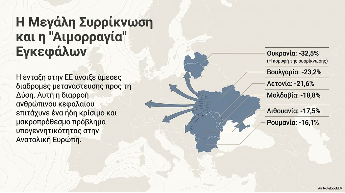 Η ένταξη στην ΕΕ άνοιξε διαδρομές μετανάστευσης προς τη Δύση για ορισμένες περιοχές της Ανατολικής Ευρώπης, επιταχύνοντας τη μακροπρόθεσμη μείωση του πληθυσμού σε μια περιοχή που ήδη αντιμετωπίζει γήρανση του πληθυσμού και χαμηλά ποσοστά γεννήσεων.