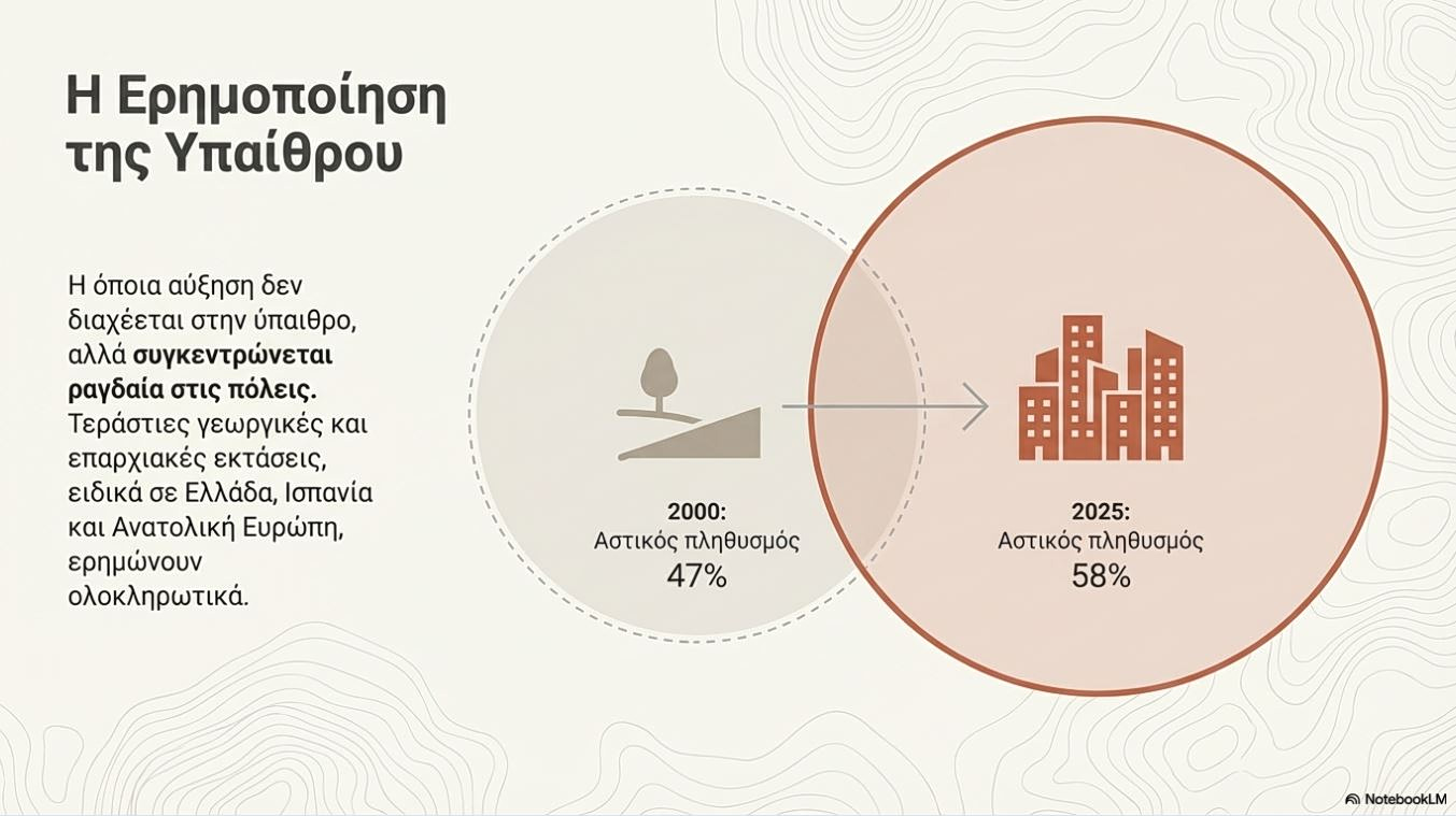 Το 2025, το ποσοστό αυτό αγγίζει το 58%. Τεράστιες εκτάσεις στην επαρχία (ειδικά σε Ελλάδα, Ισπανία και Ανατολική Ευρώπη) ερημώνουν ολοκληρωτικά.