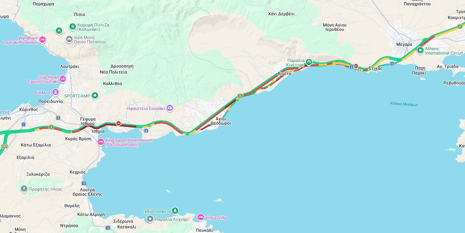 Μεγάλες καθυστερήσεις σε τμήμα δεκάδων χιλιομέτρων στην εθνική οδό Αθηνών - Κορίνθου, από Κόρινθο έως τα Μέγαρα.