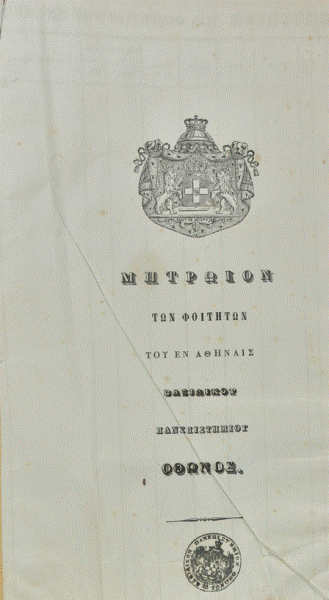 Το εσώφυλλο του πρώτου Μητρώου των Φοιτητών τού εν Αθήναις Βασιλικού Πανεπιστημίου Όθωνος (πηγή: Μουσείο Ιστορίας ΕΚΠΑ)
