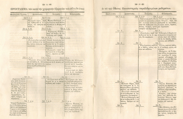 Ωρολόγιο πρόγραμμα μαθημάτων του Πανεπιστημίου των Αθηνών για το χειμερινό εξάμηνο του πρώτου έτους λειτουργίας του (πηγή: Ιστορικό Αρχείο ΕΚΠΑ)