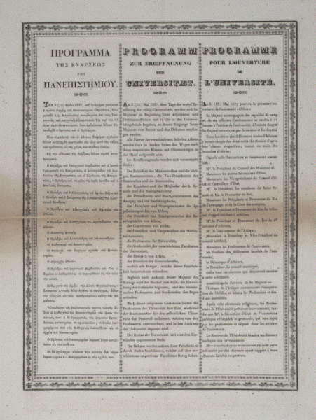 Τρίγλωσσο πρόγραμμα της ενάρξεως λειτουργίας του Πανεπιστημίου των Αθηνών (πηγή: ΓΑΚ/Φάκελος Πανεπιστήμιο Αθηνών)