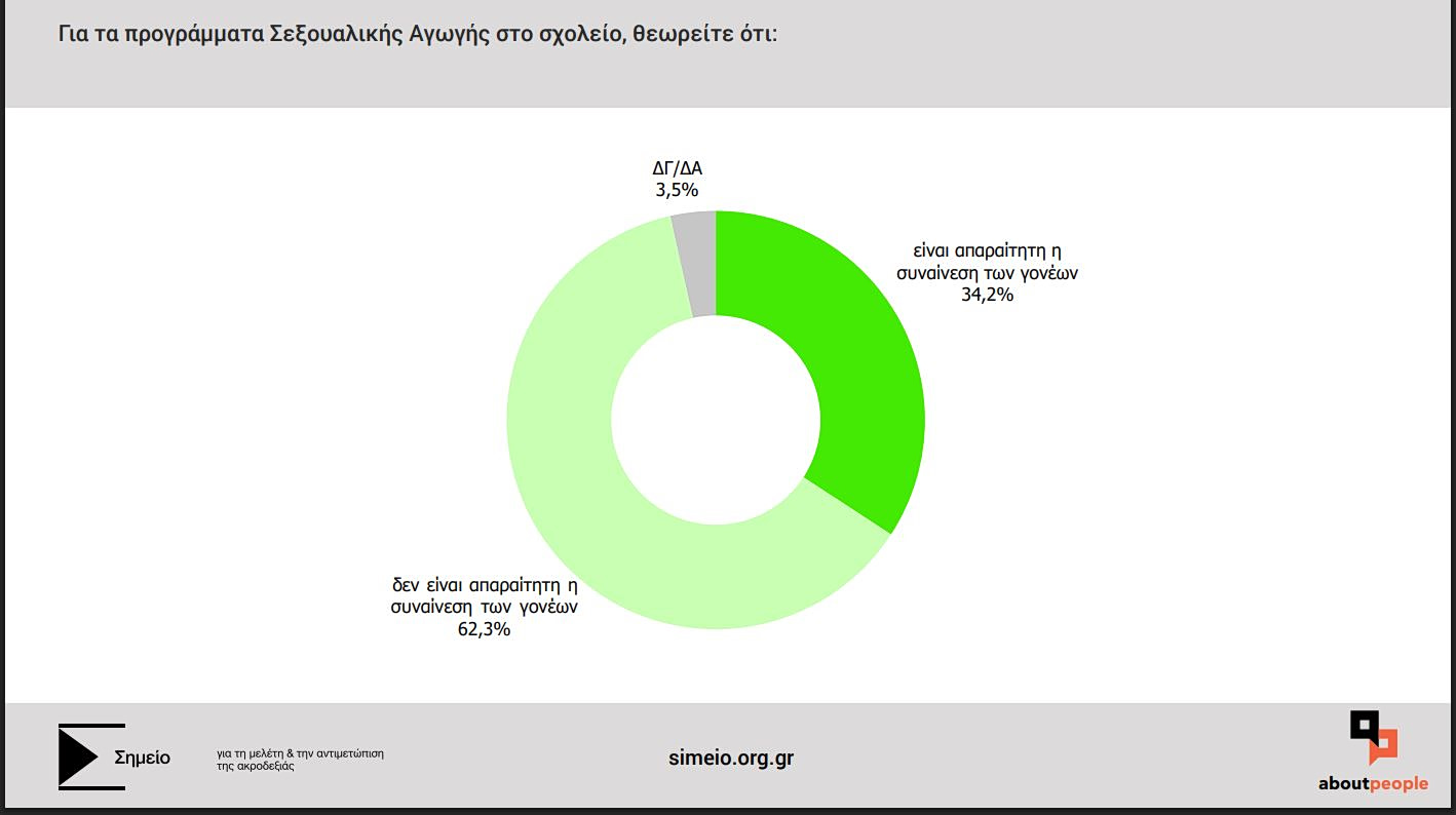 «Αυτό που κρατάω ως σημαντικό είναι ότι η πλειονότητα (62,3%) δεν θεωρεί ότι απαιτείται συναίνεση των γονέων για να υπάρχουν τέτοια εκπαιδευτικά προγράμματα», μας λέει ο Κωστής Παπαϊωάννου.