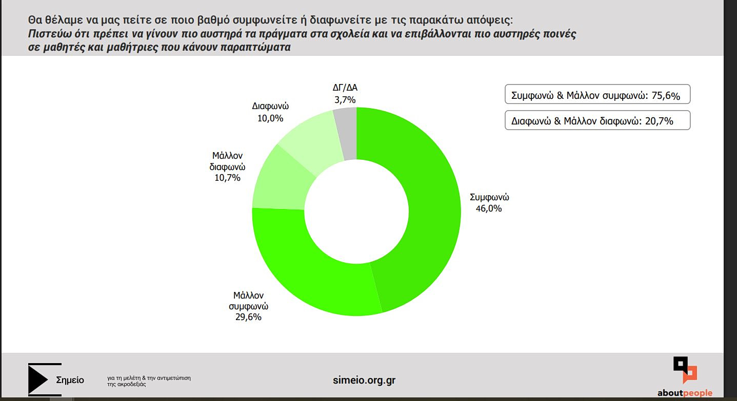 Θέλουμε ένα σχολείο που να διδάσκει περισσότερο τις αξίες της δημοκρατίας, για να γίνονται οι μαθητές καλύτεροι πολίτες στο μέλλον. Πιστεύουμε όμως παράλληλα, ότι πρέπει να επιβάλλονται αυστηρότερες ποινές  σε μαθητές και μαθήτριες που κάνουν παραπτώματα.