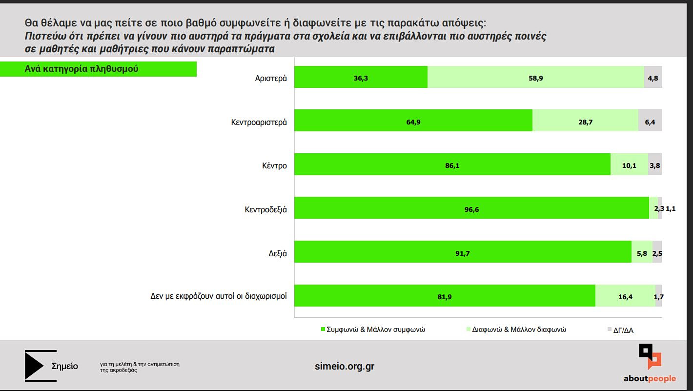 Επίσης καταγράφονται διαφοροποιήσεις ανάλογα με το πού αυτοτοποθετούνται πολιτικά οι ερωτώμενοι (όσο πιο δεξιά τόσο μικρότερο το ποσοστό που συμφωνεί).