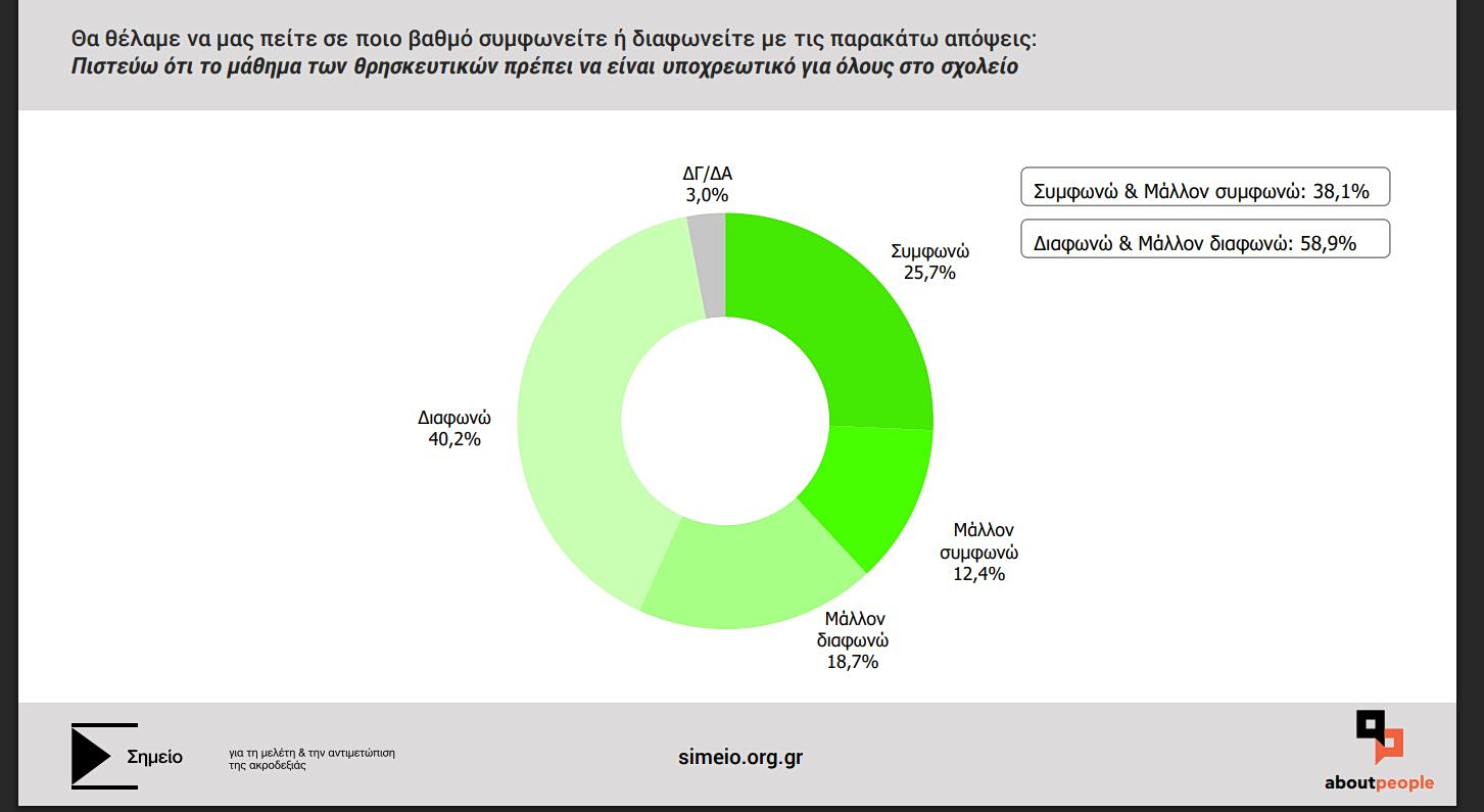 Σχεδόν οι έξι στους δέκα (58,9%), διαφωνούν με την άποψη ότι τα θρησκευτικά πρέπει να είναι υποχρεωτικό μάθημα για όλους στο σχολείο. Επίσης το 50,2% διαφωνεί με την υποχρεωτική προσευχή.