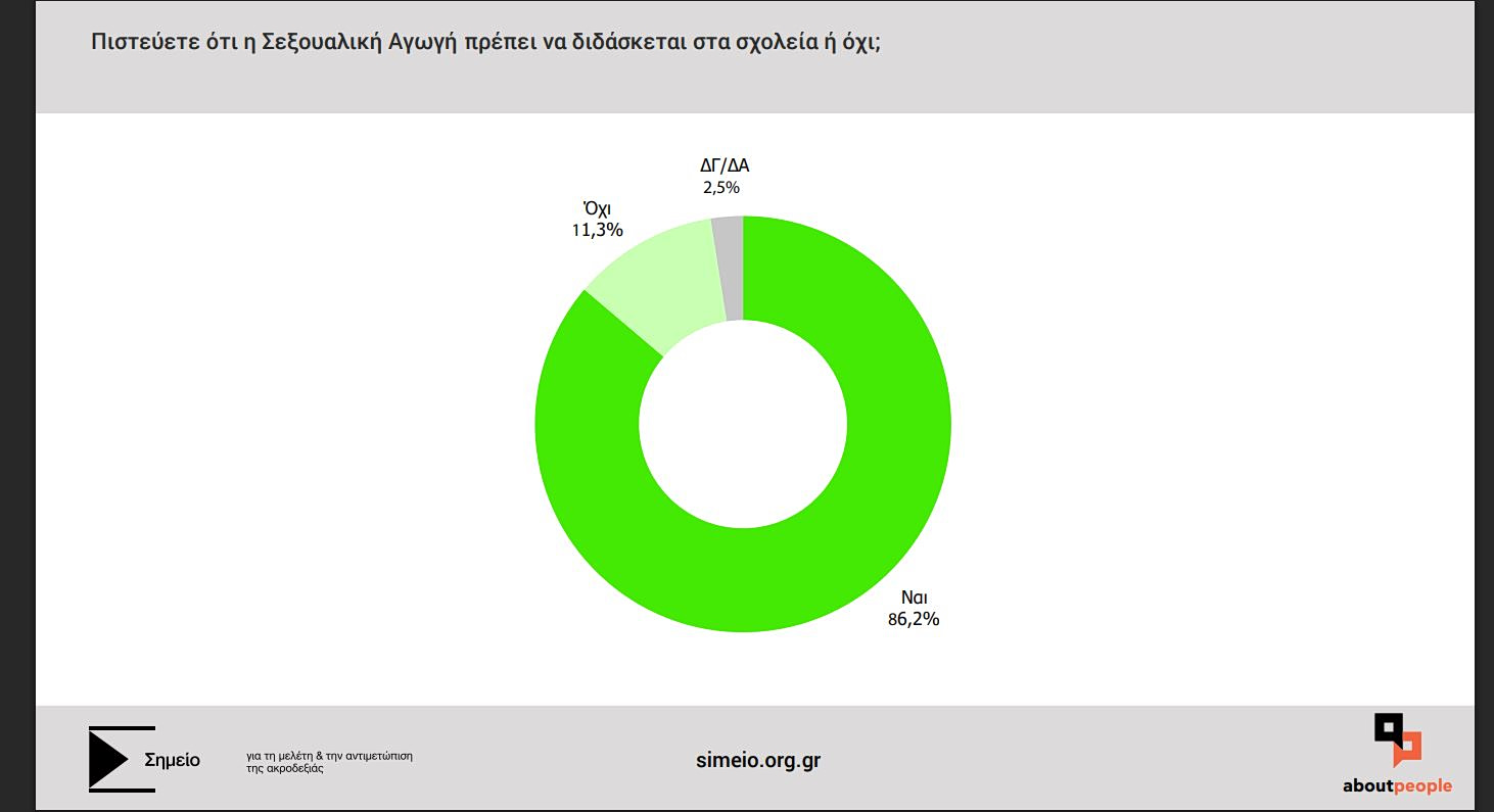 Στα θετικά ευρήματα της έρευνας, ο διευθυντής του Σημείου συγκαταλέγει την πολύ υψηλή αποδοχή της σεξουαλικής αγωγής ως ένα μάθημα που πρέπει να είναι υποχρεωτικό στην ελληνική εκπαίδευση (86% υπέρ).