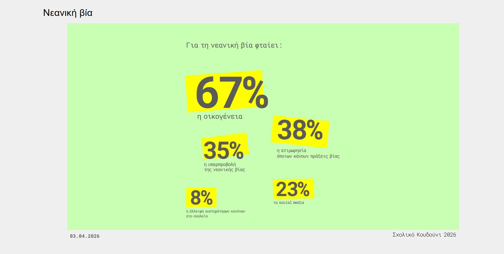 Στην ερώτηση ποιοι παράγοντες ευθύνονται για τη νεανική βία (ως δύο απαντήσεις), το 67% απαντά ότι ευθύνονται κυρίως οι γονείς.