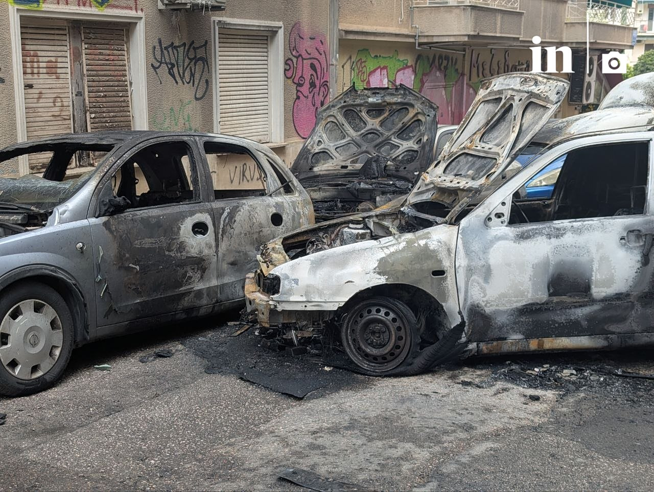 Τα κατεστραμμένα οχήματα στην Κυψέλη μετά τη φωτιά που ξέσπασε στο βαν και επεκτάθηκε