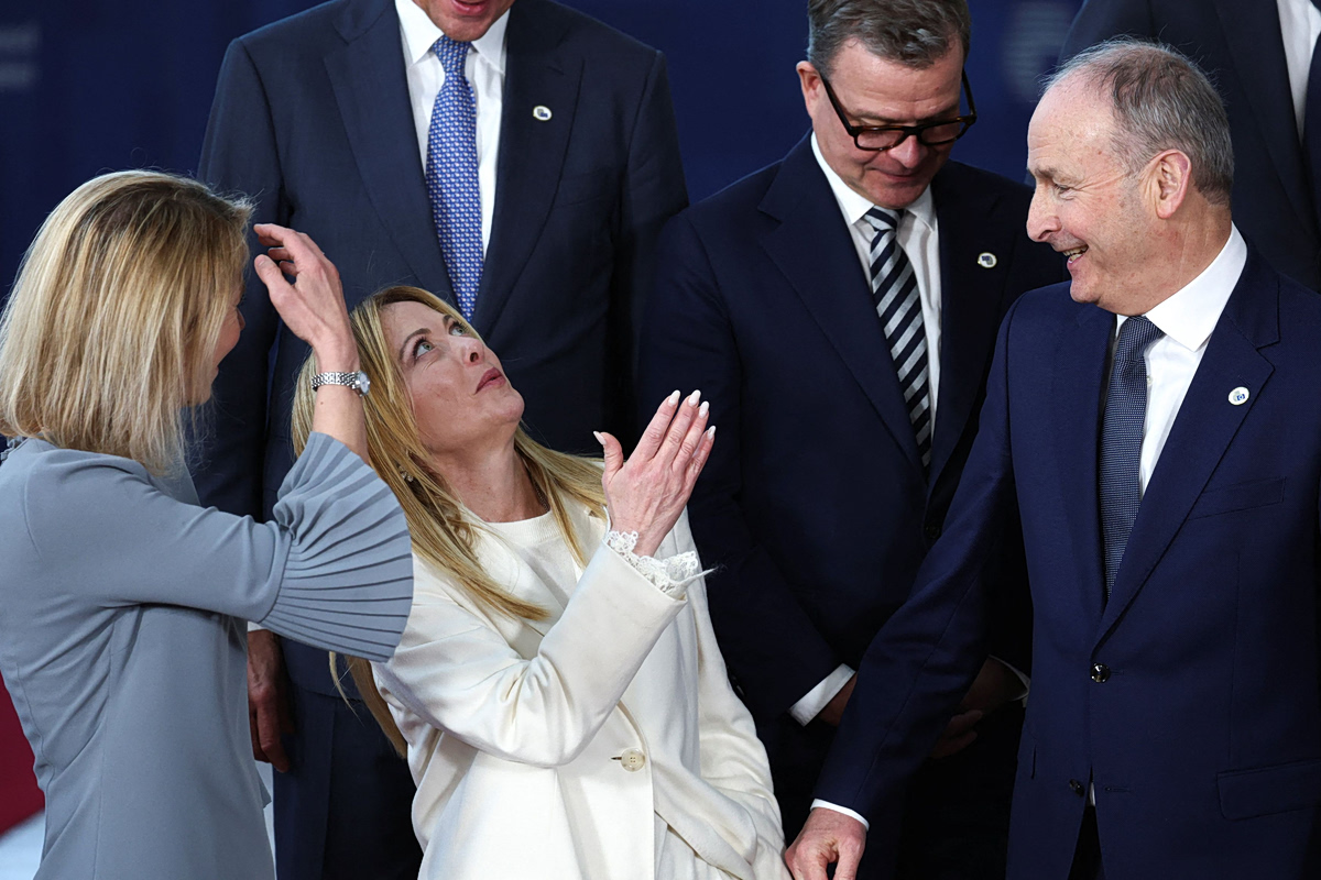 Η πρωθυπουργός της Ιταλίας Τζιόρτζια Μελόνι κάνει μια χειρονομία δίπλα στην Ύπατη Εκπρόσωπο της ΕΕ για θέματα εξωτερικής πολιτικής και πολιτικής ασφάλειας Κάγια Κάλας, τον πρωθυπουργό της Φινλανδίας Πέτερι Όρπο και τον πρωθυπουργό της Ιρλανδίας Μίκαελ Μάρτιν, καθώς οι ηγέτες συγκεντρώνονται για μια ομαδική φωτογραφία κατά τη διάρκεια της συνόδου κορυφής των ηγετών της Ευρωπαϊκής Ένωσης στις Βρυξέλλες του Βελγίου, στις 19 Μαρτίου 2026.