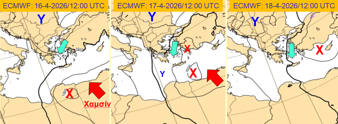 Πέρα από αυτό, το συγκεκριμένο χαμηλό, συνδυαζόμενο με τις υψηλές πιέσεις των Β. Βαλκανίων, θα προκαλέσει στην περιοχή μας ενισχυμένους ΒΑ ανέμους με ένταση ως τα 8 μποφόρ (Αιγαίο). Κατά τα άλλα, περιορισμένη απογευματινή αστάθεια αναμένεται στη ΒΔ Ελλάδα και οι υψηλότερες μέγιστες τιμές της θερμοκρασίας (23 με 24 βαθμοί) θα σημειωθούν στη Δ. Ελλάδα.