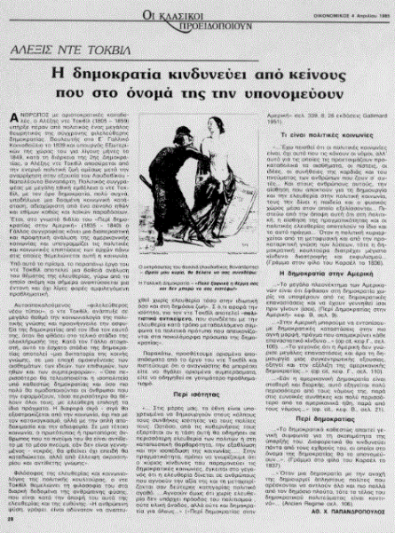 Ο Αλέξις ντε Τοκβίλ, ο ιδιόμορφος αυτός πολιτειολόγος της μετεπαναστατικής Γαλλίας, αποτέλεσε το θέμα ενός ενδιαφέροντος άρθρου που συνέγραψε προ πολλών ετών για τον «Οικονομικό Ταχυδρόμο» ο διακεκριμένος δημοσιογράφος και συγγραφέας Αθανάσιος Παπανδρόπουλος. Το εν λόγω κείμενο του Παπανδρόπουλου, εκλεκτού στελέχους του «Οικονομικού Ταχυδρόμου» και του ΔΟΛ επί σειράν ετών, είχε δημοσιευτεί στο τεύχος της 4ης Απριλίου 1985.