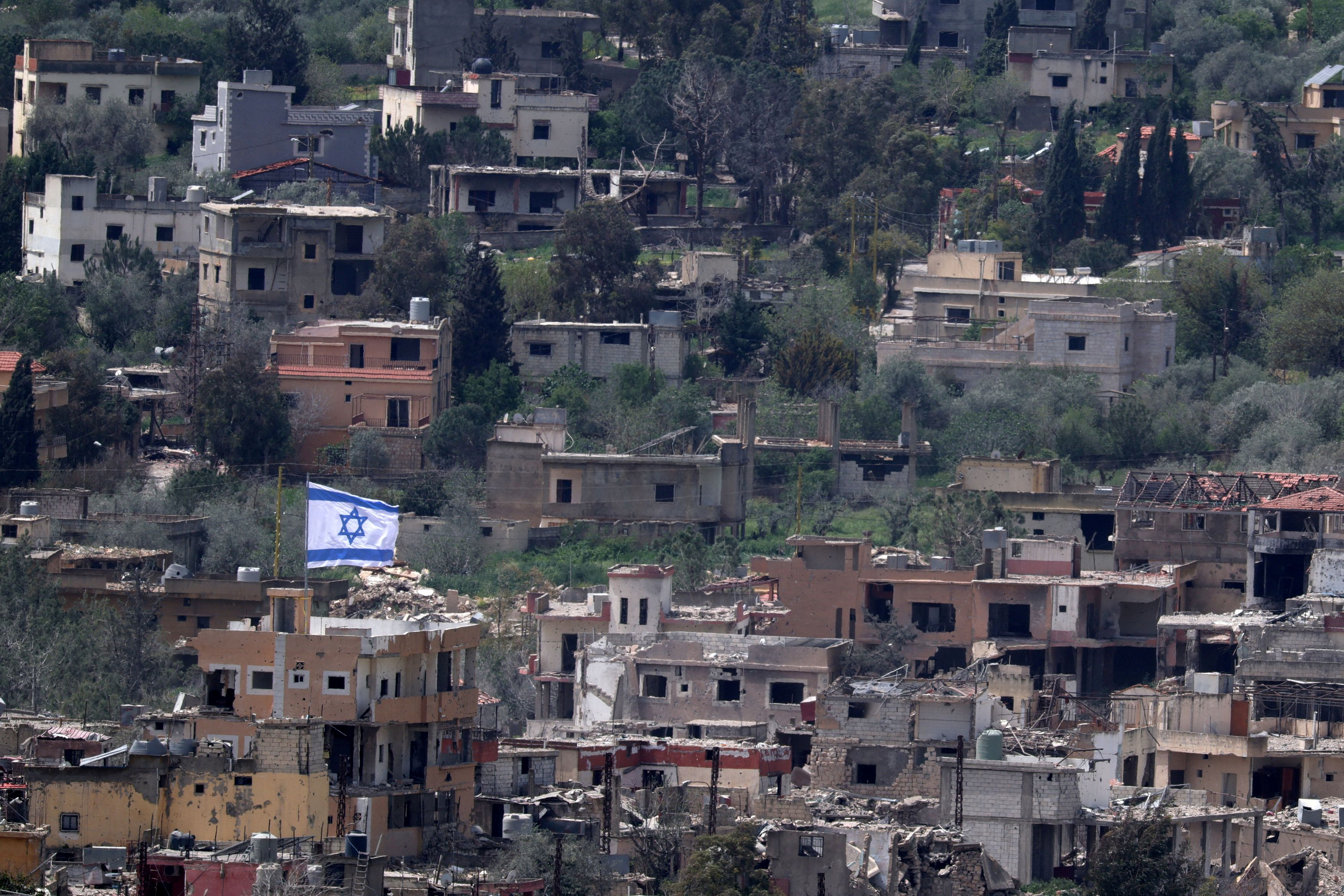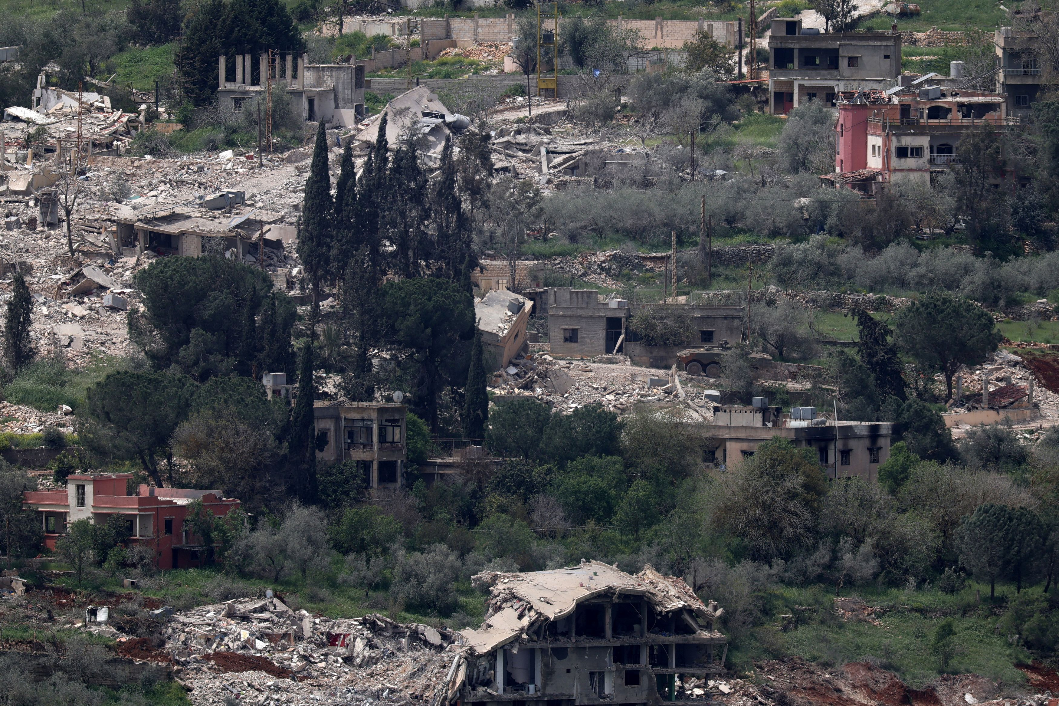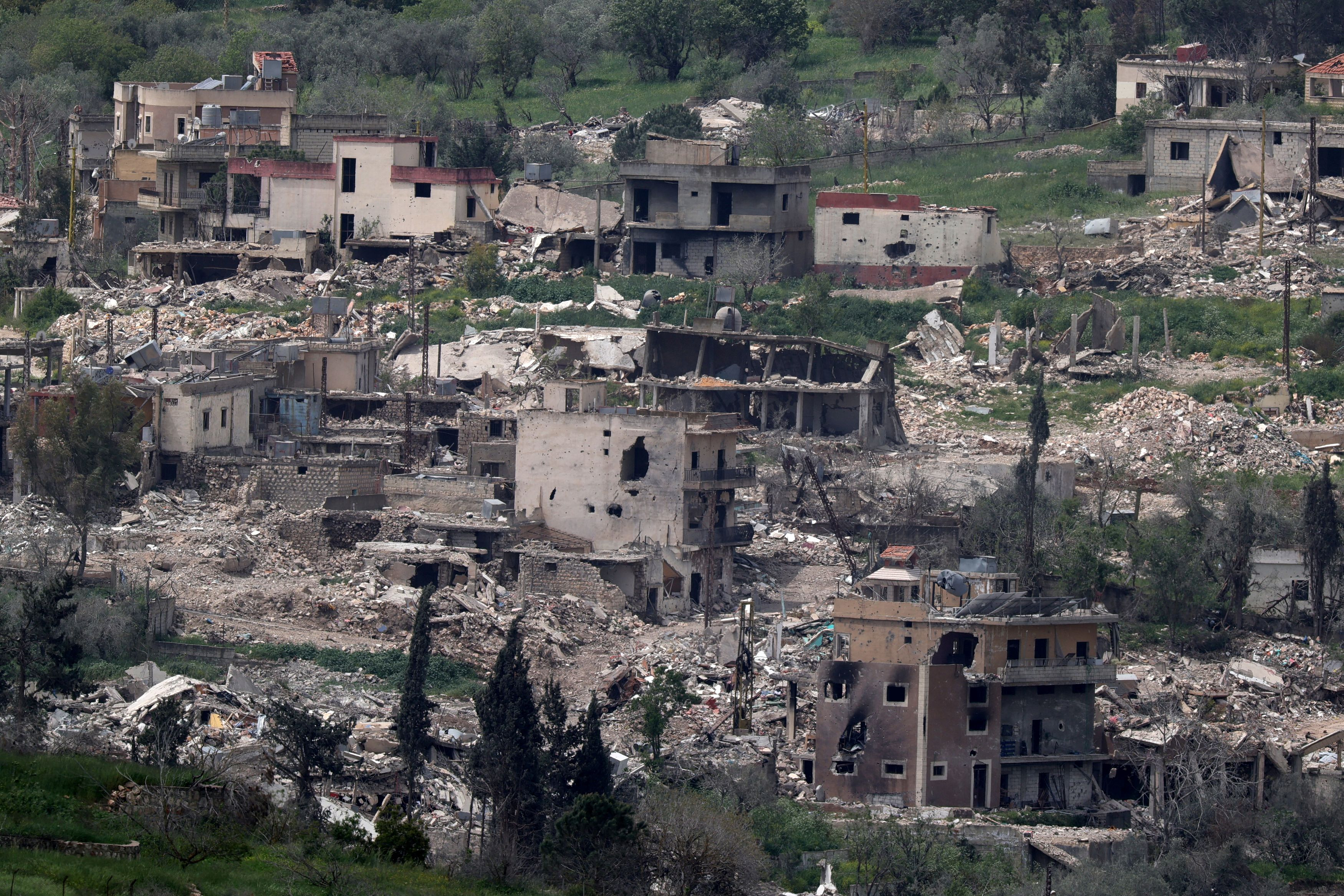 Damaged buildings on the Lebanese side of the Israel-Lebanon border as an armoured vehicle stands, after a 10-day ceasefire between Lebanon and Israel went into effect, as seen from Israel, April 17, 2026. REUTERS/Florion Goga