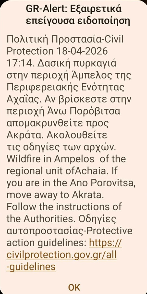 Λόγω των ισχυρών ανέμων λίγο μετά τις 5 το απόγευμα ενεργοποιήθηκε το 112 καλώντας τους κατοίκους στο χωριό Άνω Πορόβιτσα να απομακρυνθούν προς Ακράτα.