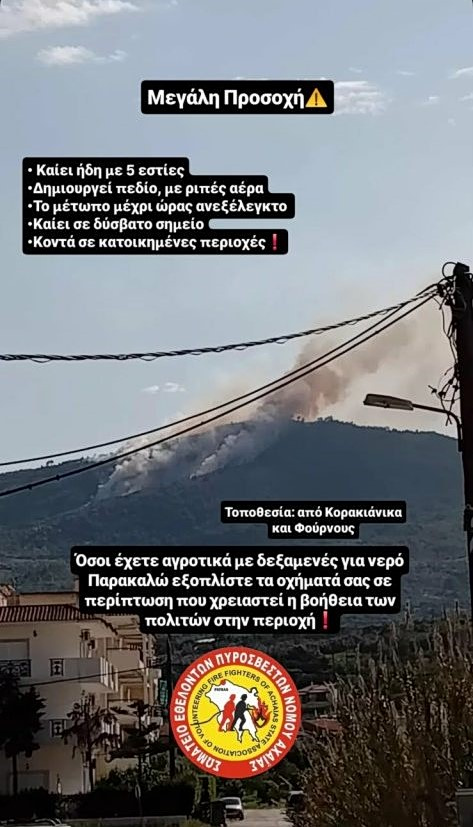 Η φωτιά καίει σε δασική έκταση στην περιοχή Άμπελος στην Ακράτα και λόγω των ισχυρών ανέμων δόθηκε εντολή εκκένωσης για το χωριό Άνω Πορόβιτσα