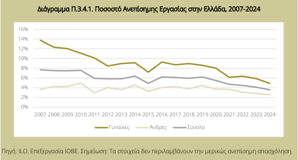 Οι γυναίκες πλήττονται περισσότερο, ειδικά στις μη αστικές περιοχές, με ποσοστά διπλάσια από αυτά των ανδρών. Η απόκλιση από την ΕΕ είναι επίσης εντονότερη στον γυναικείο πληθυσμό και την περιφέρεια. Παρά την σταδιακή μείωση που παρατηρείται τα τελευταία έτη, καθώς τα ποσοστά της Ελλάδας παραμένουν υψηλότερα του ευρωπαϊκού μέσου όρου, αναδεικνύεται η ανάγκη για στοχευμένες παρεμβάσεις πολιτικής για την ενίσχυση της ισότητας και της ασφάλειας στην αγορά εργασίας, για λόγους κοινωνικής δικαιοσύνης και υγιούς ανταγωνισμού των επιχειρήσεων.