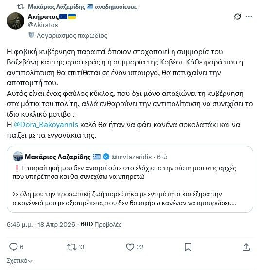 Του έπεσε βαριά η παραίτηση από τη θέση του υφυπουργού του Μακάριου Λαζαρίδη και επιτέθηκε στη Ντόρα Μπακογιάννη, αναδημοσιεύοντας γαλάζιο troll του X
