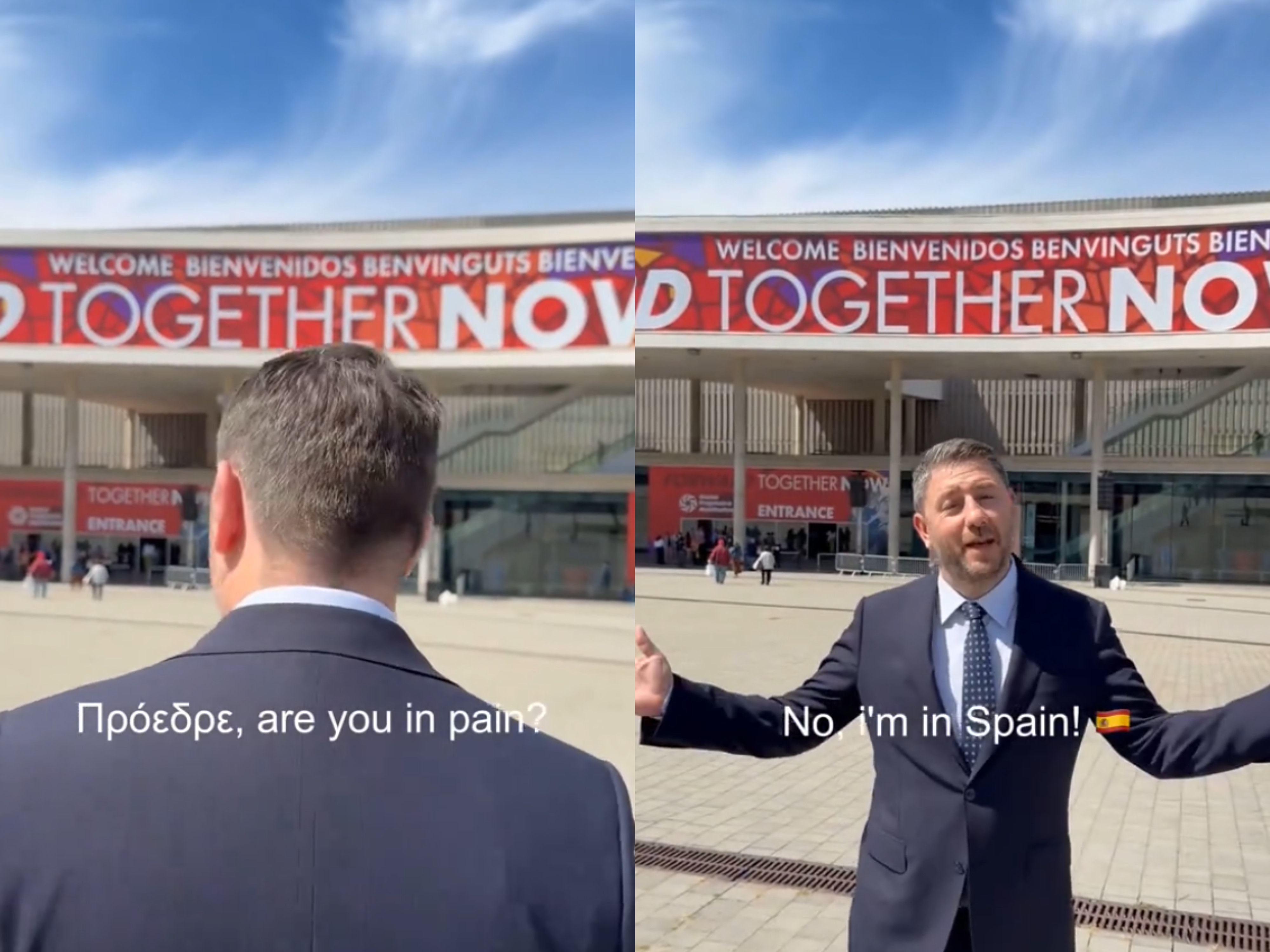 Το βίντεο ξεκινά με τον «πρόεδρο» Νίκο Ανδρουλάκη να ερωτάται: «are you in pain?» και να απαντά «no, I’m in Spain».