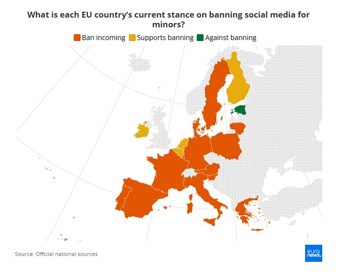 Από τον Νότο έως τον Βορρά, η συντριπτική πλειονότητα των κρατών-μελών της ΕΕ κινείται προς απαγορεύσεις ή αυστηρούς περιορισμούς, με μόνη εξαίρεση την Εσθονία. Η Ελλάδα, με ένα από τα υψηλότερα ποσοστά χρήσης social media από νέους, συμμετέχει ενεργά στο πιλοτικό πρόγραμμα της ευρωπαϊκής εφαρμογής επαλήθευσης ηλικίας, με επερχόμενες απαγορεύσεις (ban incoming).