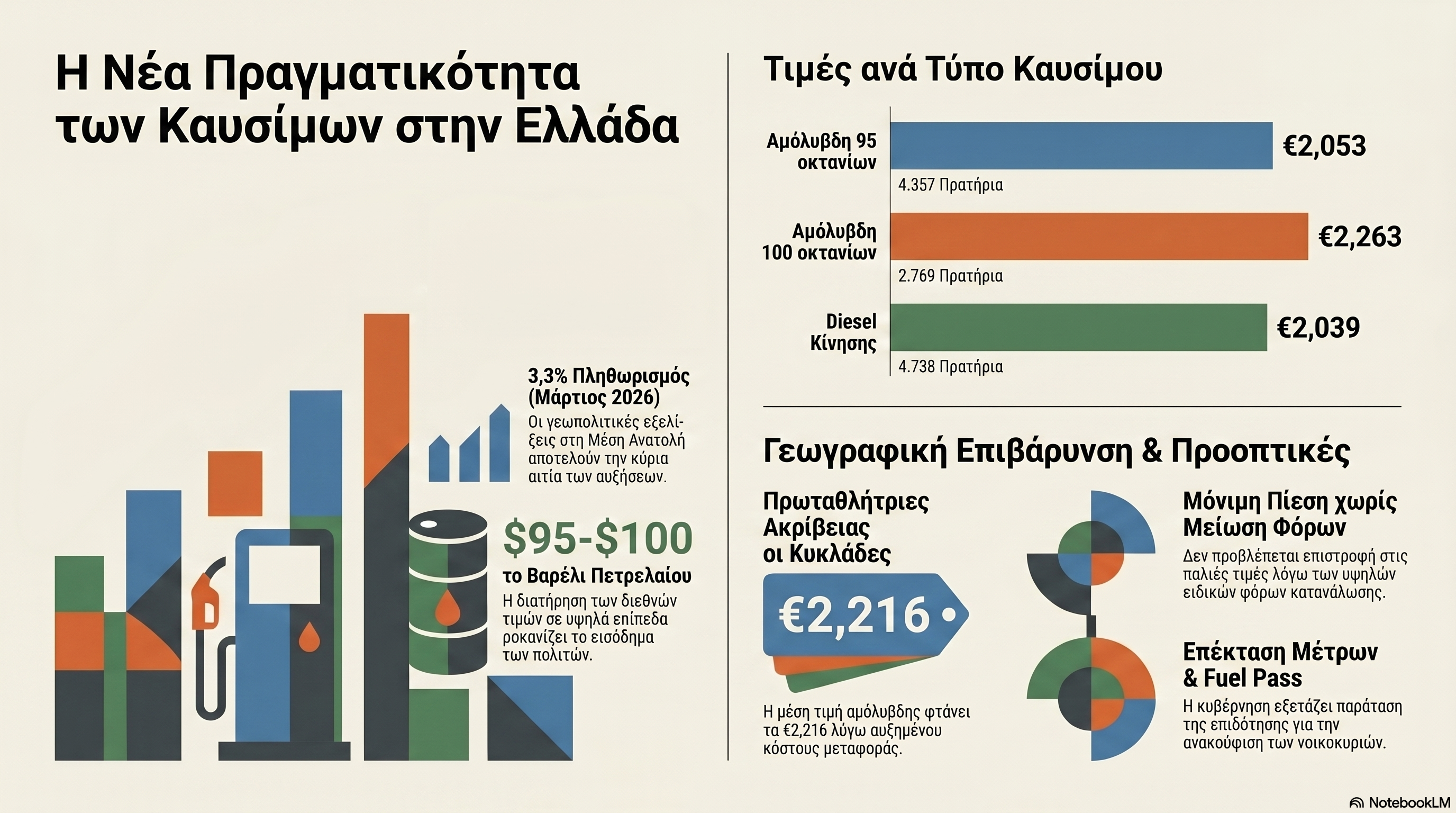 Η εικόνα για τα καύσιμα στην Ελλάδα δείχνει μια παγιωμένη κατάσταση υψηλών τιμών, με τη μέση τιμή της αμόλυβδης 95 οκτανίων να έχει σταθεροποιηθεί πάνω ή λίγο κάτω από το ψυχολογικό όριο των 2 ευρώ ανά λίτρο πανελλαδικά. Η «γεωγραφία» της ακρίβειας και οι δυστοπικές προβλέψεις.