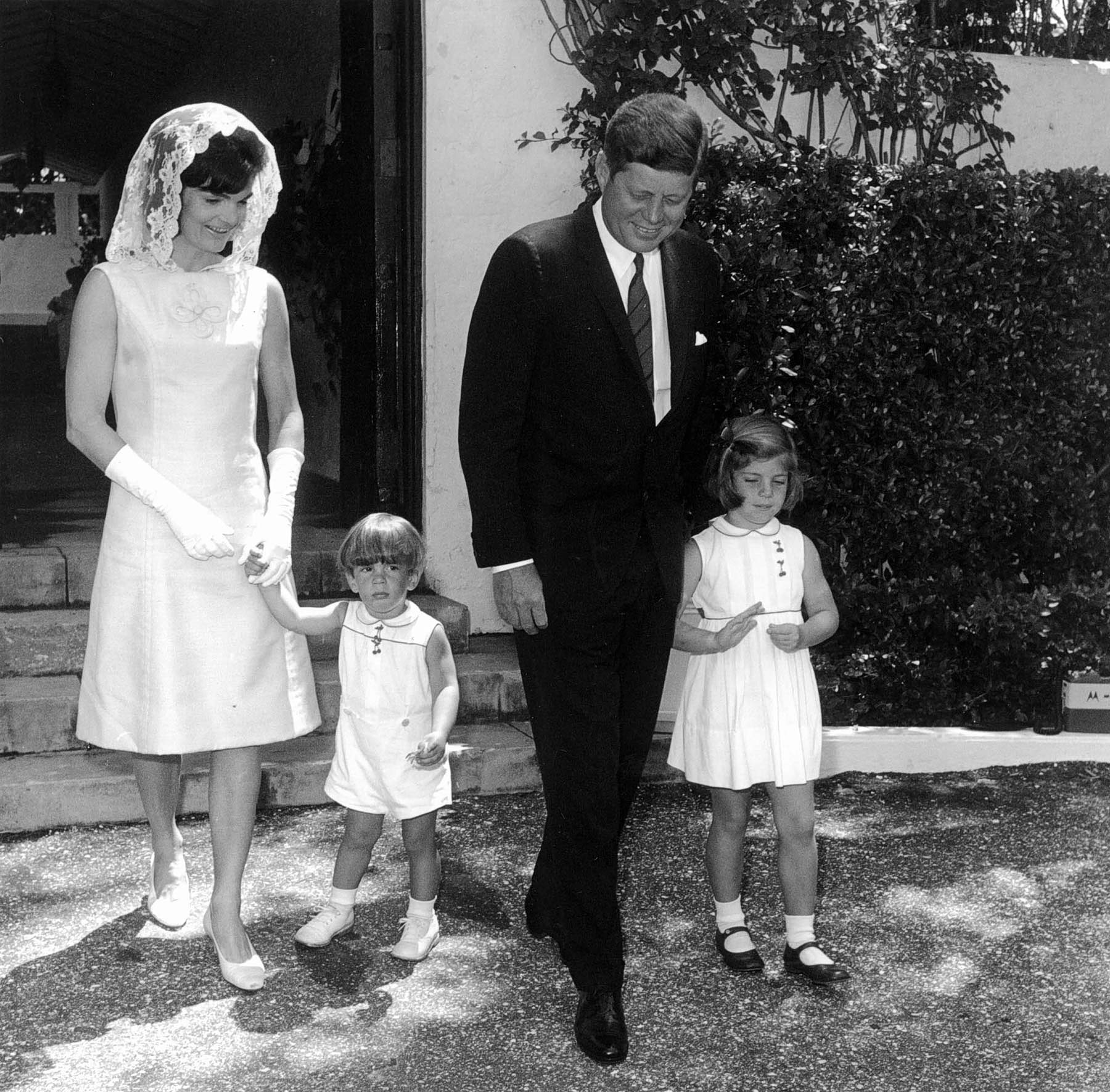 Ο Πρόεδρος Τζον Φ. Κένεντι, η σύζυγός του Τζάκλιν και τα παιδιά τους Καρολάιν και Τζον Φ. Κένεντι Τζούνιορ ποζάρουν μπροστά από την οικία του Τζόζεφ Κένεντι κατά τη διάρκεια του Πάσχα, σε αυτή την αρχειακή φωτογραφία του Απριλίου 1963.