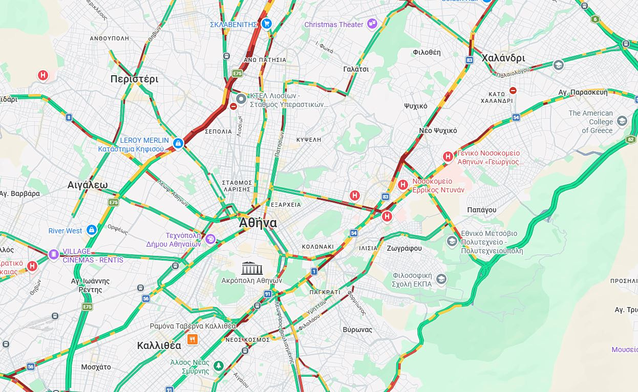 Αυξημένη είναι η κίνηση στη Λεωφόρο Κηφισίας, στη Μεσογείων, στη Συγγρού, στην Καλιρρόης, στην Αρδηττού, στην Αλεξάνδρας, στη Βασ. Σοφίας, στην Πανεπιστημίου,