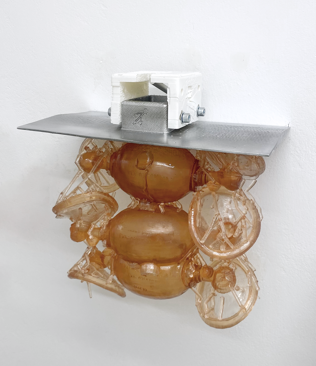 Στη σειρά Hosts (2025), η έμφαση στρέφεται από την παγίδευση στη συμβίωση. Μηχανικά εξαρτήματα και αποτυπώματα φέρουν οργανικά στοιχεία από ρητίνη που θυμίζουν παράσιτα ή κουκούλια σε αδιευκρίνιστο στάδιο μετασχηματισμού. Ξενιστής και φιλοξενούμενος αλληλοεξαρτώνται σε βαθμό που η διάκριση παύει να έχει νόημα. Αυτό που προκύπτει παραμένει υπόλειμμα μιας διαδικασίας σε εξέλιξη. Στο Untitled (2026), η μορφή της κηρήθρας, εξ ορισμού οργανική και ζωντανή, αποτυπώνεται σε ρητίνη ως παγωμένη, αδιαπέραστη, ανενεργή.