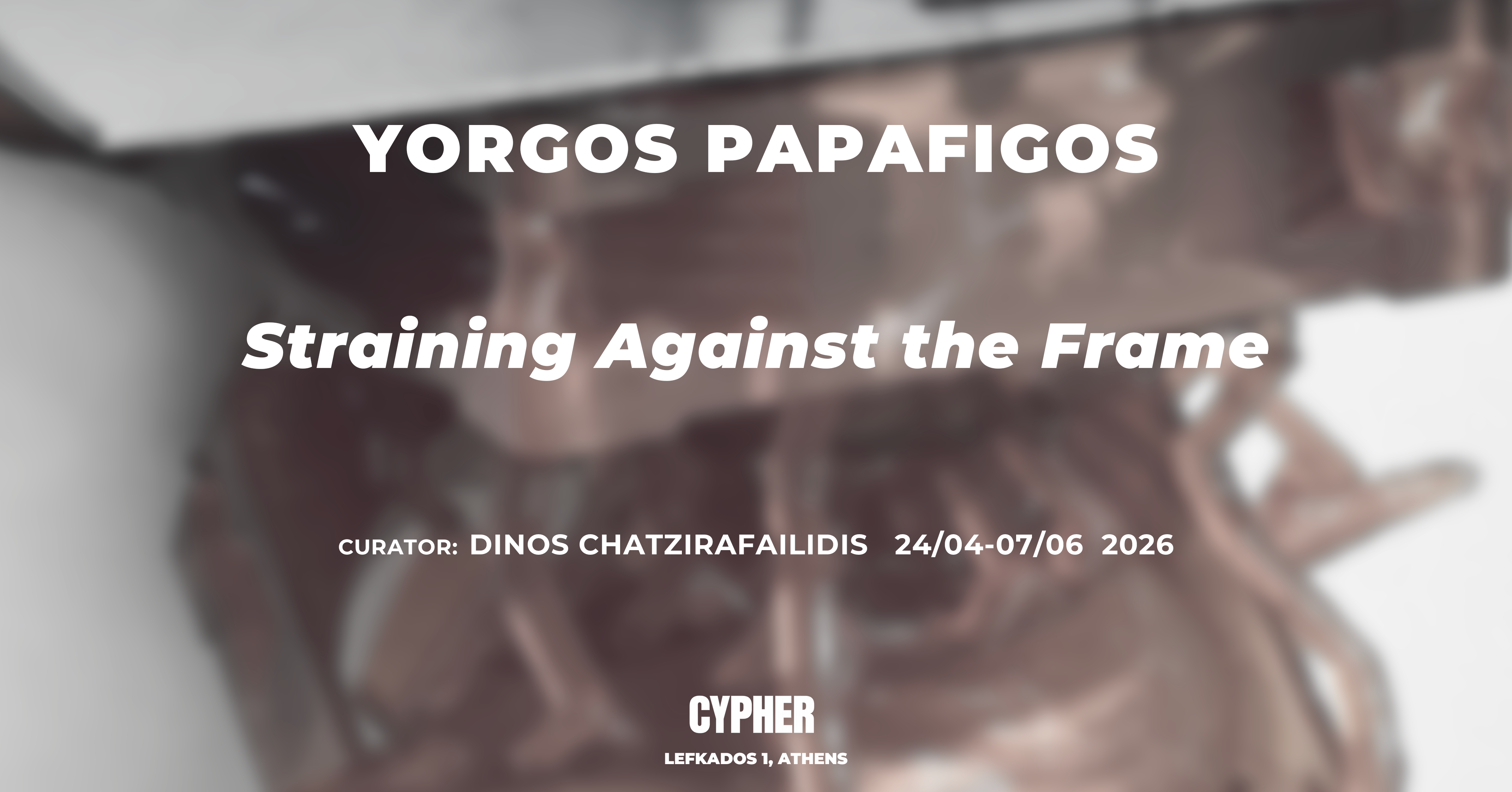 Η ανεξάρτητη γκαλερί CYPHER φιλοξενεί τη νέα ατομική έκθεση του Γιώργου Παπαφίγκου, σε επιμέλεια του Ντίνου Χατζηραφαηλίδη. Με τον τίτλο Straining Against the Frame, η έκθεση φέρνει στο προσκήνιο ένα πρόσφατο σύνολο έργων, μέσα από το οποίο ο καλλιτέχνης αναπτύσσει υβριδικές κατασκευές που εξερευνούν έννοιες όπως ο εγκλωβισμός, η προστασία και ο έλεγχος.