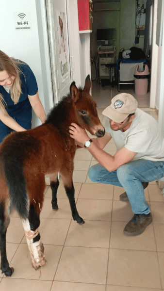 Την ίδια μέρα, το μεταφέρουν στην ιππίατρο Κατερίνα Σοφού, που βρίσκεται στην Κόρινθο. Του παρέχει την κτηνιατρική φροντίδα και ανακοινώνει στους εθελοντές ότι το πουλαράκι πρέπει να υποβληθεί σε ακτινογραφίες.
