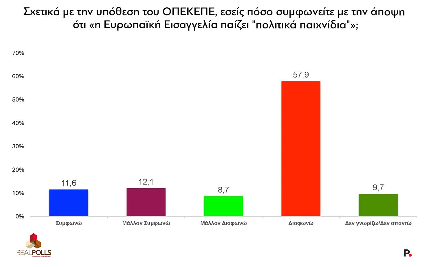 Στην ερώτηση αν συμφωνούν ότι «η Ευρωπαϊκή Εισαγγελία παίζει πολιτικά παιχνίδια» στην υπόθεση ΟΠΕΚΕΠΕ, μόλις το 23,7% συμφωνεί (11,6% «συμφωνώ»  και 12,1% «μάλλον συμφωνώ»), ενώ το 66,6% διαφωνεί: εντυπωσιακά, το 57,9% επιλέγει το κατηγορηματικό «διαφωνώ».