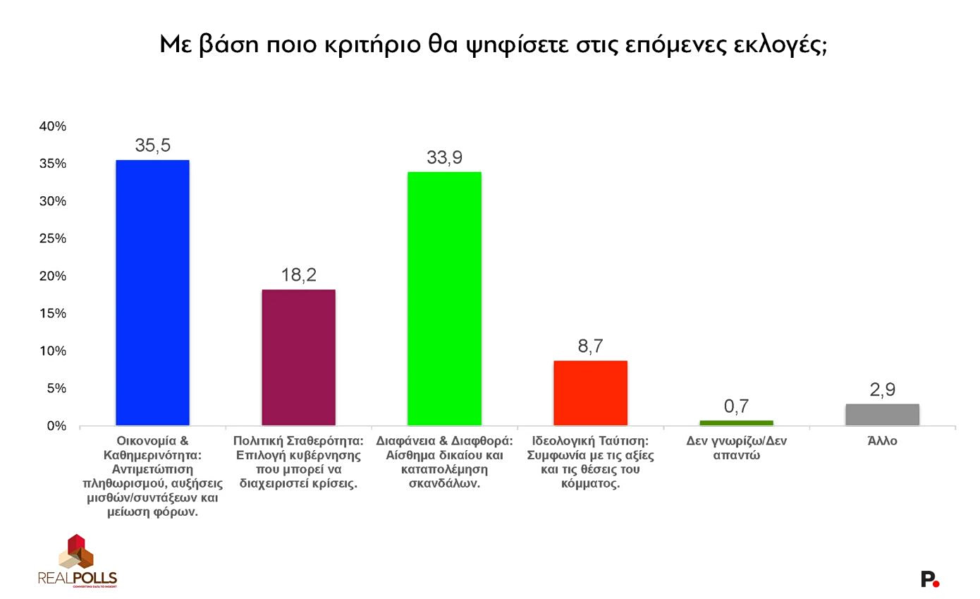 Στην ερώτηση για το κριτήριο ψήφου στις επόμενες εκλογές όποτε κι αν γίνουν αυτές, η κατάταξη είναι επίσης ενδιαφέρουσα: πρώτη με 35,5% είναι η οικονομία και η καθημερινότητα (πληθωρισμός, μισθοί, φόροι), δεύτερη με 33,9% η διαφάνεια και η διαφθορά. Η πολιτική σταθερότητα ακολουθεί στο 18,2%, ενώ η ιδεολογική ταύτιση καταλαμβάνει μόλις το 8,7%.