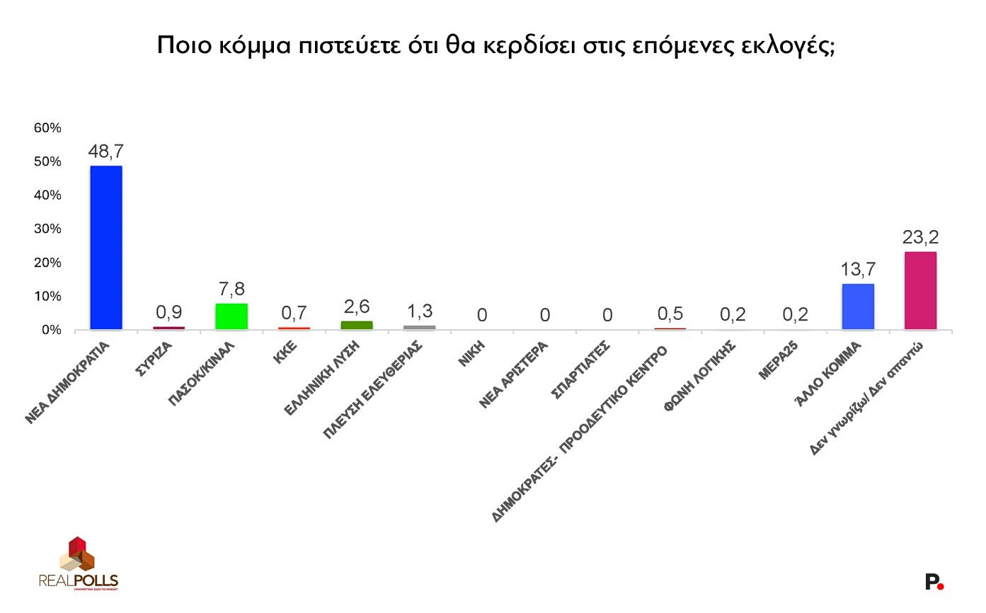 Στην ερώτηση για το ποιο κόμμα πιστεύουν οι πολίτες ότι θα κερδίσει τις επόμενες εκλογές, η ΝΔ παραμένει σαφώς και αδιαμφισβήτητα πρώτη, όμως με κάποια αισθητή υποχώρηση: στο 48,7% (από 54,3% τον Μάρτιο). Το ΠΑΣΟΚ φτάνει στο 7,8% (από 4,7% του Μαρτίου), η Ελληνική Λύση στο 2,6%, η Πλεύση Ελευθερίας στο 1,3%. Ενα 13,7% επιλέγει «άλλο κόμμα» (από 11,2% τον Μάρτιο) και ένα αξιοσημείωτο 23,2% (από 20,9% στην προηγούμενη μέτρηση) απαντά «δεν γνωρίζω».