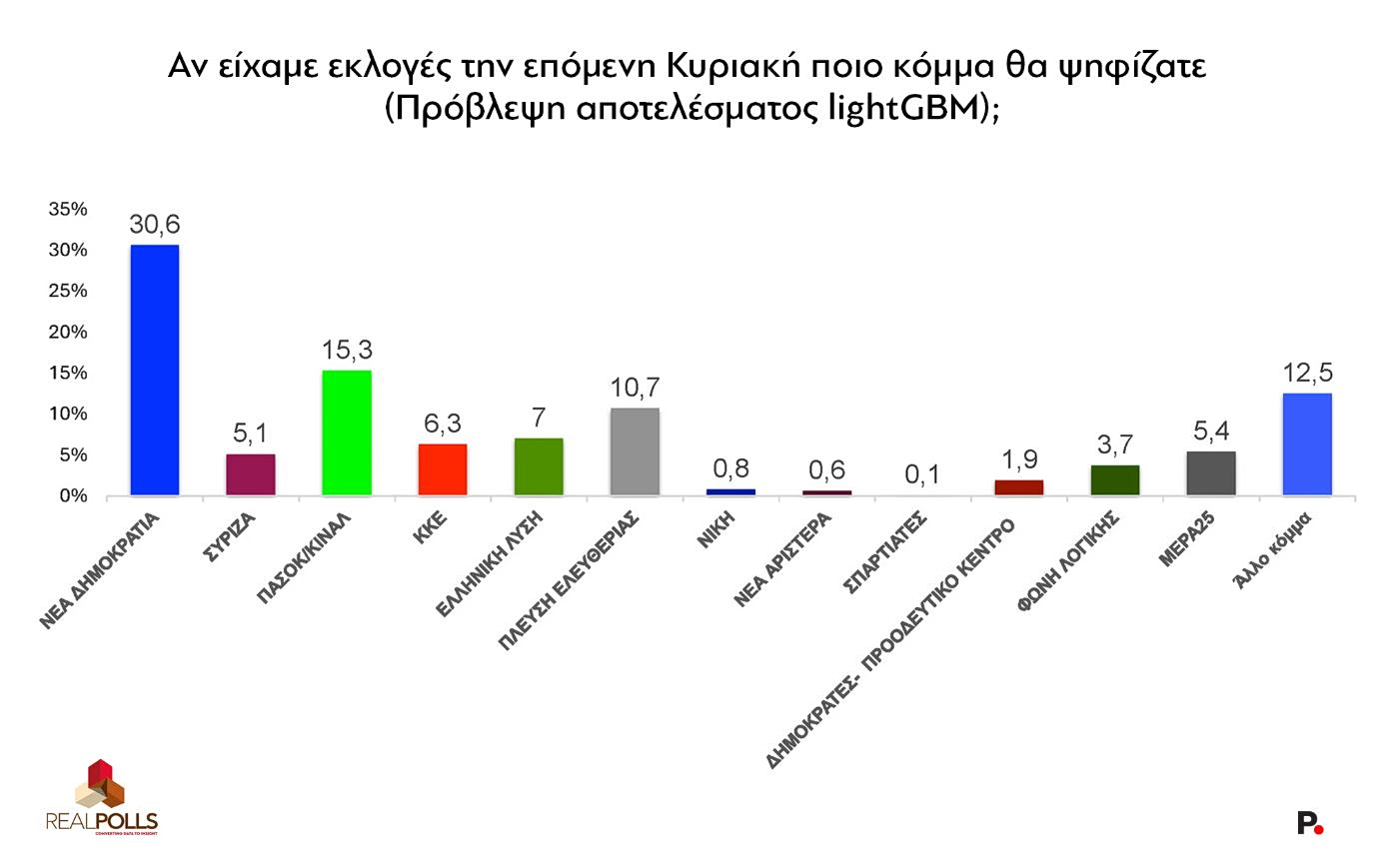 Παρά τη σαφή μείωση των ποσοστών στην πρόθεση ψήφου, η εικόνα είναι ελαφρά διαφορετική στην πρόβλεψη εκλογικού αποτελέσματος: η έρευνα της RealPolls δίνει στη ΝΔ 30,6% (από 30,8% τον Μάρτιο), πτώση οριακή.
