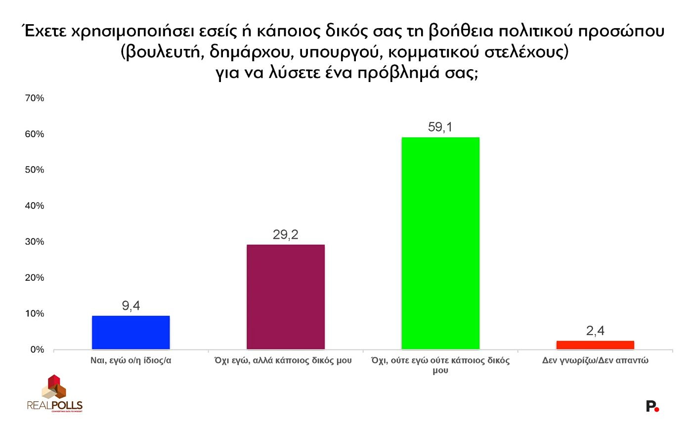 Με το ρουσφέτι να έχει επανέλθει με εμφατικό τρόπο στη δημόσια σφαίρα μετά τις τελευταίες αποκαλύψεις με τους εμπλεκόμενους πολιτικούς στην υπόθεση του ΟΠΕΚΕΠΕ ένα 9,4% των ερωτηθέντων δηλώνει ευθέως ότι το έχει χρησιμοποιήσει προσωπικά, ένα 29,2% ότι το έχει χρησιμοποιήσει κάποιος δικός του· συνολικά, σχεδόν τέσσερις στους δέκα πολίτες (38,6%) έχουν άμεση εμπειρία από το ρουσφέτι και το δηλώνουν. Το 59,1% απαντά αρνητικά.