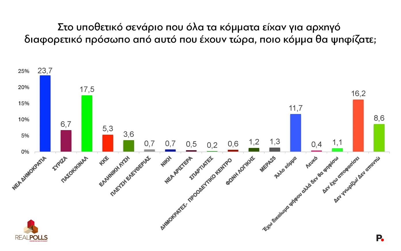 Η κλασική πλέον ερώτηση της έρευνας της RealPolls για το σενάριο στο οποίο όλα τα κόμματα είχαν διαφορετικούς αρχηγούς επιβεβαιώνει ευρήματα προηγούμενων μηνών. Η ΝΔ χωρίς τον Κυριάκο Μητσοτάκη υποχωρεί ελαφρά στο 23,7% (από 24,6% στην πρόθεση), μια πτώση 0,9 μονάδων που υποδηλώνει ισχυρό κομματικό πυρήνα.