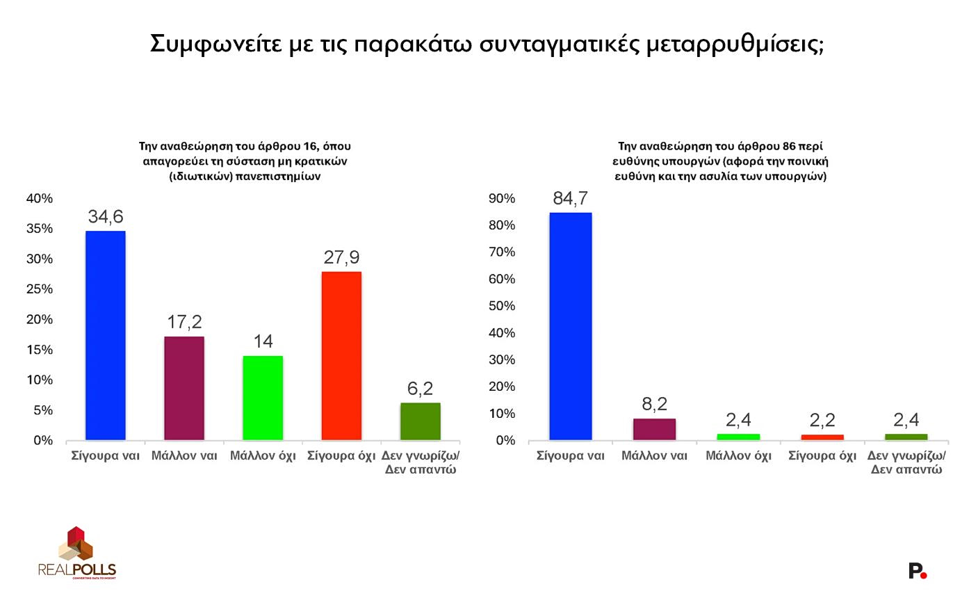Ενδεικτικό του κλίματος που επικρατεί στην κοινωνία είναι το κεφάλαιο της έρευνας που αφορά τις συνταγματικές μεταρρυθμίσεις. Η αναθεώρηση του άρθρου 86 για την ποινική ευθύνη και την ασυλία των υπουργών συγκεντρώνει το εκπληκτικό 92,9% θετικών απαντήσεων (84,7% «σίγουρα ναι» και 8,2% «μάλλον ναι»), με μόλις 4,6% να αντιτίθεται.