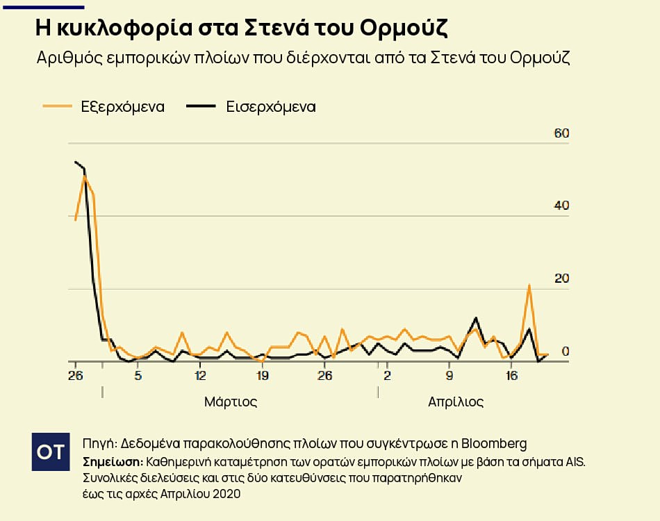 Το Ιράν επέτρεψε σε ορισμένα πλοία, συμπεριλαμβανομένων εκείνων που μετέφεραν το δικό του πετρέλαιο, να διασχίσουν τη θαλάσσια οδό μέσω ενός διαδρόμου που ακολουθεί την ιρανική ακτή, μερικές φορές ζητώντας πληρωμές που έφταναν τα 2 εκατομμύρια δολάρια. Ετσι, ενώ τα φορτία από άλλους εξαγωγείς της περιοχής είχαν μειωθεί κατά περισσότερο από 95% μέχρι τα μέσα Μαρτίου, οι αποστολές ιρανικού πετρελαίου είχαν μειωθεί μόνο ελαφρώς σε σχέση με τα προπολεμικά επίπεδα, σύμφωνα με στοιχεία της εταιρείας πληροφοριών Kpler.
