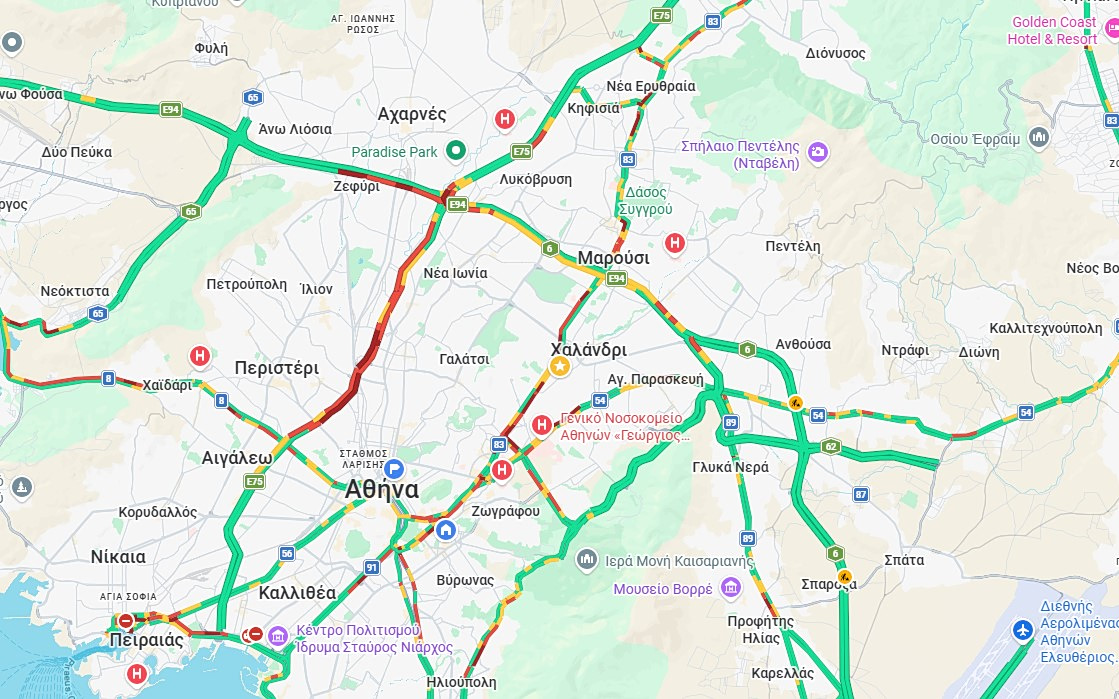 Παράλληλα, αρχίζει να επιβαρύνεται και ο περιφερειακός Καρέα, από την Ηλιούπολη έως την Καισαριανή, ενώ αυξημένη κίνηση παρατηρείται επίσης στη λεωφόρο Γαλατσίου και στη λεωφόρο Αλεξάνδρας.