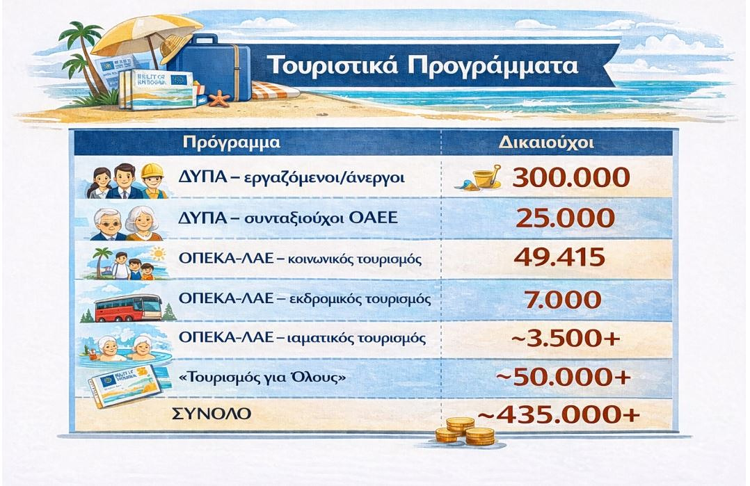 Παράλληλα «τρέχουν» τα προγράμματα του Λογαριασμού Αγροτικής Εστίας του ΟΠΕΚΑ (περίπου 60.000 δικαιούχοι) και το πρόγραμμα «Τουρισμός για Όλους» του Υπουργείου Τουρισμού (προϋπολογισμός άνω των 25 εκατ. ευρώ). Συνολικά, τα τέσσερα προγράμματα καλύπτουν περίπου 435.000 δικαιούχους, με δαπάνη γύρω στα 90–95 εκατ. ευρώ.